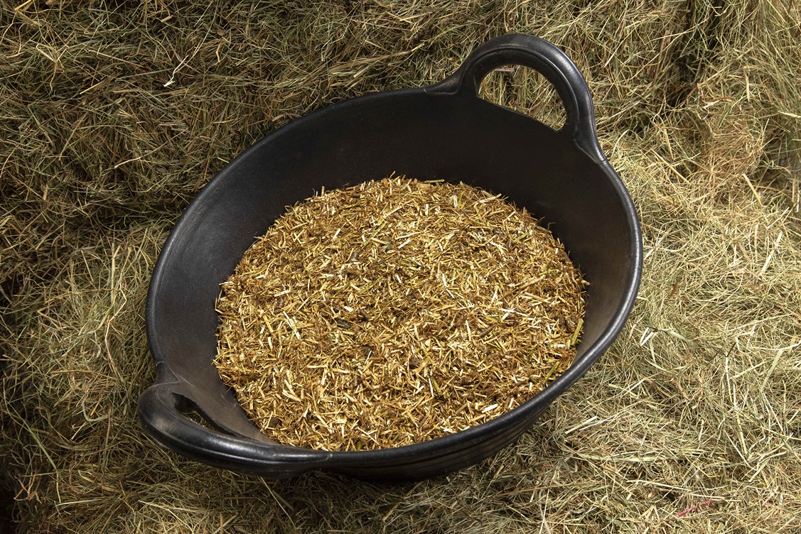 - Includes a blend of short chopped alfalfa and straw to extend eating time.